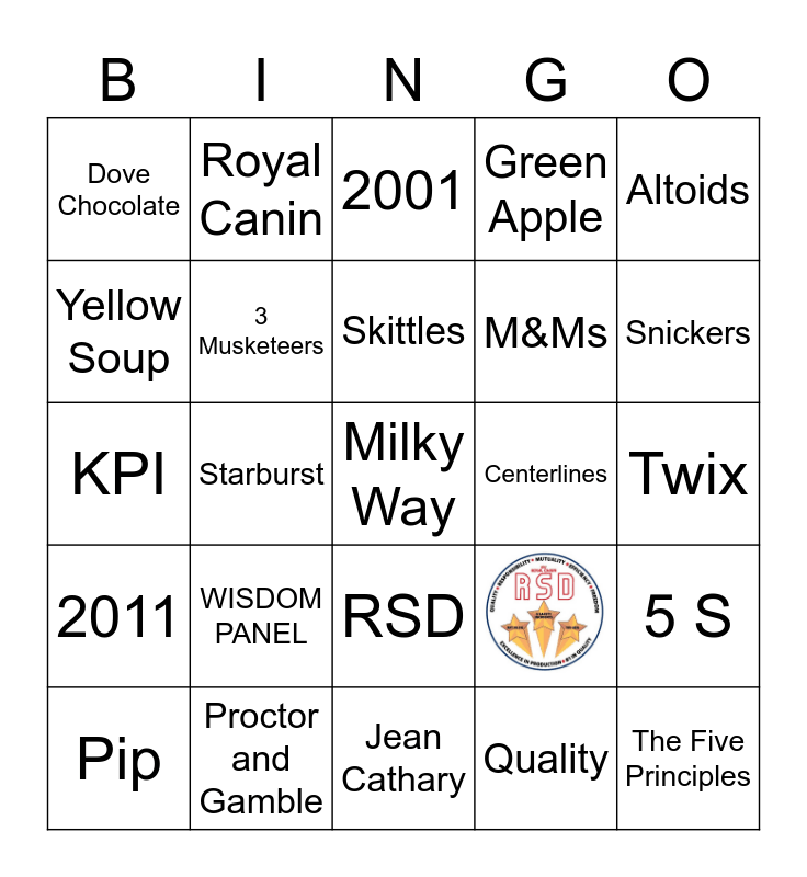 This bingo card has 1 images and 26 words: The Five Principles, M&Ms, Jean Cathary, Yellow Soup, 2001, Royal Canin, 2011, Centerlines, 5 S, KPI, Green Apple, Pip, Proctor and Gamble, Snickers, Eukanuba, 3 Musketeers, Skittles, WISDOM PANEL, Dove Chocolate, Twix, Quality, Starburst, Milky Way, RSD, Altoids and Nutrition Academy.