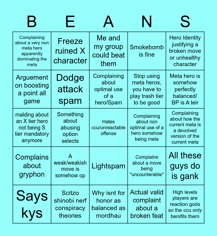 This bingo card has a free space and 37 words: Something about freeze being pretentious, This is boring high level is boring, These guys turtle/never attack, Complaining about non optimal use of a hero somehow being meta, Complaining about how the current meta is a devolved version of the current meta, Complains about gryphon, Something about abusing option selects, Bash Spam, Stop using meta heros, you have to play trash tier to be good, Why isnt my favorite youtuber here?, Arguement on boosting a point all game, Dodge attack spam, Actual valid complaint about a broken feat, Hero Identity justifying a broken move or unhealthy character, Complaining about a very non meta hero apparently dominating the meta, Scitzo shinobi nerf conspiracy theories, Lightspam, Smokebomb is fine, Meta hero is somehow perfectly balanced/ BP is A teir, malding about an X tier hero not being S tier mandatory anymore, Freeze ruined X character, Complaining about optimal use of a hero/Spam, a broken tier 4 is somehow balanced, All these guys do is gank, Comp community is ruining the game, X useful move isn't strong enough, Me and my group could beat them, Duels is ultra skillful, Freeze controls the devs, Freeze was payed off by the devs, Stamina bullying is good/stops spam, Why isnt for honor as balanced as mordhau, Complains about a move being "uncounterable", High levels players are reaction gods so the ccu only benifits them, Says kys, A weak/weakish move is somehow op and Ties in LB to the subject unneccessarily.