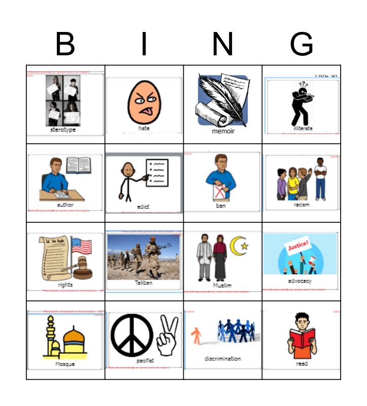 I Am Malala Vocabulary Bingo Card