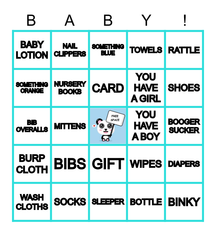 This bingo card has a free space and 39 words: BABY TOY, HAMPER, HAT, NURSERY BOOKS, WASH CLOTHS, GIFT, CARD, TEETHER, RATTLE, BURP CLOTH, MITTENS, TOWELS, BINKY, BOOGER SUCKER, YOU HAVE A BOY, BIBS, STUFFED ANIMAL, BABY LOTION, SOMETHING GREEN, WIPES, SOMETHING ORANGE, SLEEPER, YOU HAVE A GIRL, SHOES, SOMETHING RED, BOOTIES, BLANKET, BABY WASH, ONESIE, NAIL CLIPPERS, MOMMY SPA DAY, BABY POWDER, SOMETHING BLUE, SOCKS, BOTTLE, PACK & PLAY, DIAPERS, BIB OVERALLS and YOU'RE A GRANDMA OR GRANDPA.