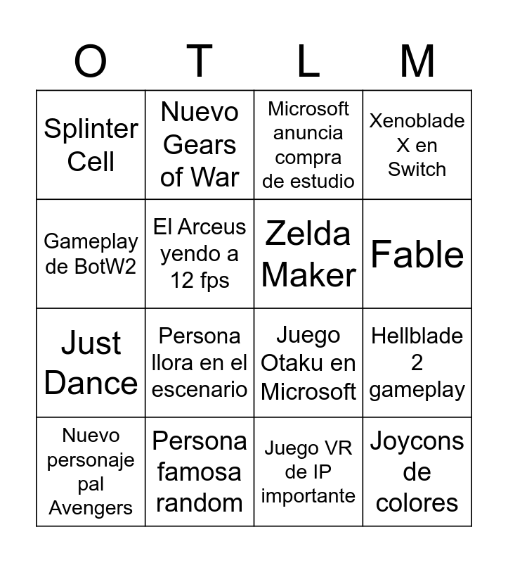 This bingo card has 16 words: Persona famosa random, Hellblade 2 gameplay, Microsoft anuncia compra de estudio, Splinter Cell, Just Dance, Nuevo Gears of War, Juego Otaku en Microsoft, Juego VR de IP importante, Gameplay de BotW2, El Arceus yendo a 12 fps, Nuevo personaje pal Avengers, Xenoblade X en Switch, Persona llora en el escenario, Fable, Zelda Maker and Joycons de colores.