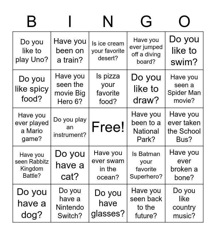 This bingo card has a free space and 34 words: Have you seen back to the future? Do you like pizza? Have you played the game Roblox Terminal Railways? Have you seen Rabbitz Kingdom Battle? Have you seen the movie Big Hero 6?, Have you seen back to the future?, Do you like pizza?, Have you played the game Roblox Terminal Railways?, Have you seen Rabbitz Kingdom Battle?, Have you seen the movie Big Hero 6?, Do you like to swim?, Do you have a dog?, Have you been on a train?, Have you been out of the country?, Is pizza your favorite food?, Is ice cream your favorite desert?, Do you play baseball?, Do you play soccer?, Have you been to a National Park?, Have you seen a Spider Man movie?, Do you have a Nintendo Switch?, Have you ever played a Mario game?, Do you have a cat?, Is Batman your favorite Superhero?, Have you ever swam in the ocean?, Is your favorite game cuphead?, Do you like to play Uno?, Have you ever taken the School Bus?, Do you have glasses?, Do you like country music?, Have you ever jumped off a diving board?, Have you ever gone camping?, Do you like to draw?, Do you like spicy food?, Do you like to read comic books?, Do you play an instrument?, Have you ever broken a bone? and Have you ever taken the School Bus?.