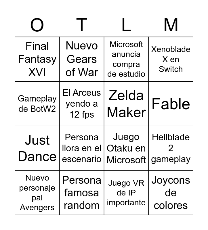 This bingo card has 16 words: Persona famosa random, Hellblade 2 gameplay, Microsoft anuncia compra de estudio, Final Fantasy XVI, Just Dance, Nuevo Gears of War, Juego Otaku en Microsoft, Juego VR de IP importante, Gameplay de BotW2, El Arceus yendo a 12 fps, Nuevo personaje pal Avengers, Xenoblade X en Switch, Persona llora en el escenario, Fable, Zelda Maker and Joycons de colores.