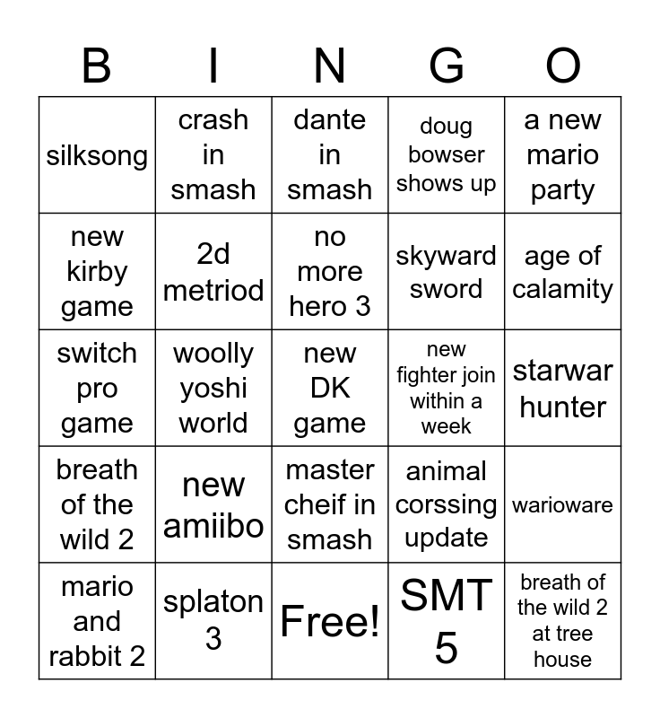 This bingo card has 25 words: breath of the wild 2, splaton 3, new DK game, SMT 5, a new mario party, silksong, crash in smash, dante in smash, new fighter join within a week, warioware, new kirby game, 2d metriod, Free!, animal corssing update, age of calamity, mario and rabbit 2, woolly yoshi world, no more hero 3, skyward sword, starwar hunter, switch pro game, new amiibo, master cheif in smash, doug bowser shows up and breath of the wild 2 at tree house.