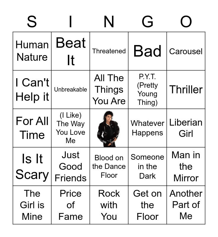 This bingo card has a free space and 71 words: Billie Jean, Beat It, Smooth Criminal, Don't Stop 'Til You Get Enough, Rock with You, The Way You Make Me Feel, Bad, They Don't Care About Us, P.Y.T. (Pretty Young Thing), Wanna Be Startin' Somethin', The Girl is Mine, Baby Be Mine, Thriller, Human Nature, The Lady In My Life, For All Time, Someone in the Dark, Carousel, Speed Demon, Liberian Girl, Just Good Friends, Another Part of Me, Man in the Mirror, I Just Can't Stop Loving You, Dirty Diana, Leave Me Alone, Don't Be Messin' Round, I'm So Blue, Song Groove, Free, Price of Fame, Fly Away, Streetwalker, Workin' Day and Night, Get on the Floor, Off the Wall, Girlfriend, She's Out of My Life, I Can't Help it, Burn This Disco Out, Blood on the Dance Floor, Ghosts, Is It Scary, Morphine, Superfly Sister, You Rock My World, Butterflies, Unbreakable, Heartbreaker, Invincible, Break of Dawn, Speechless, Whatever Happens, One Day In Your Life, Just A Little Bit Of You, Music and me, All The Things You Are, Ain't No Sunshine, Maria (You Were The Only One), You've Got A Friend, Girl Don't Take Your Love From Me, Keep Your Head Up, (I Like) The Way You Love Me, Hollywood Tonight, Hold My Hand, Scream, Threatened, Remember The Time, Jam, In The Closet and Dangerous.