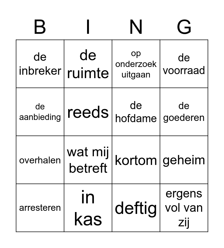 This bingo card has 20 words: geheim, openlijk, op onderzoek uitgaan, betrappen, arresteren, de aanbieding, in kas, de inbreker, overhalen, de ruimte, wat mij betreft, kortom, reeds, ergens vol van zij, de hofdame, de knecht, de goederen, de voorraad, deftig and uitbeelden.