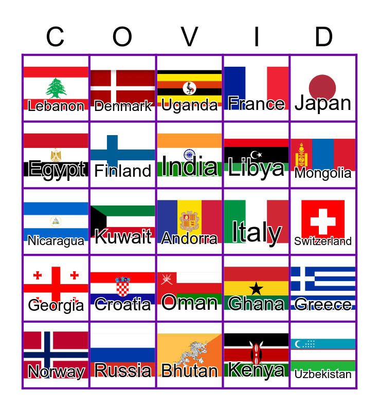This bingo card has 46 images and 46 words: Argentina, Andorra, Brazil, Bhutan, Croatia, Canada, Denmark, Austria, Egypt, Ethiopia, Finland, France, Greece, Ghana, Hungary, Bahamas, India, Italy, Jamaica, Japan, Kuwait, Kenya, Lebanon, Libya, Malaysia, Mongolia, Norway, Nepal, Oman, Georgia, Palestin, Portugal, Qatar, Iceland, Romania, Russia, Switzerland, Slovakia, Thailand, Tanzania, Uzbekistan, Uganda, Nicaragua, Panama, Ukraine and Zimbabwe.