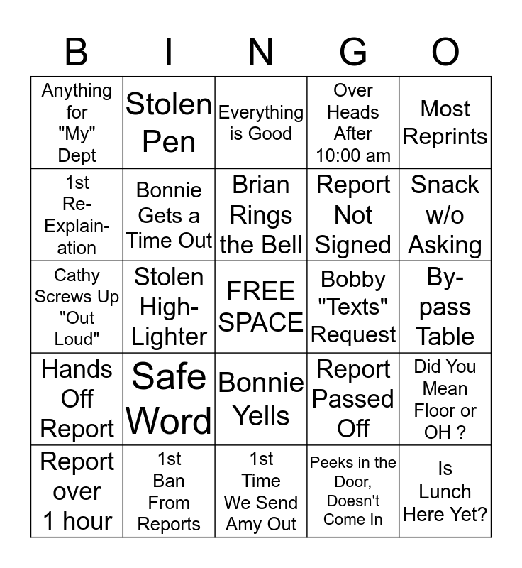 This bingo card has a free space and 24 words: Safe Word, 1st Ban From Reports, Brian Rings the Bell, Report over 1 hour, Most Reprints, Anything for "My" Dept, 1st Re- Explain- ation, Stolen Pen, Bobby "Texts" Request, Bonnie Yells, Report Not Signed, Cathy Screws Up "Out Loud", Report Passed Off, Did You Mean Floor or OH ?, Bonnie Gets a Time Out, Peeks in the Door, Doesn't Come In, By-pass Table, Everything is Good, Snack w/o Asking, Stolen High- Lighter, Is Lunch Here Yet?, Hands Off Report, Over Heads After 10:00 am and 1st Time We Send Amy Out.