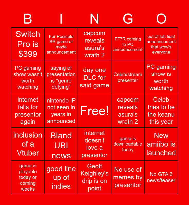This bingo card has a free space and 24 words: Bland UBI news, good line up of indies, day one DLC for said game, game is playable today or coming weeks, out of left field announcement that wow's everyone, Switch Pro is $399, PC gaming show wasn't worth watching, For Possible BR game or mode announcement, capcom reveals asura's wrath 2, internet doesn't love a presentor, Celeb/stream presenter, internet falls for presentor again, game is downloadable today, New amiibo is launched, saying of presentation is "genre defying", No use of memes by presentor, Celeb tries to be the keanu this year, capcom reveals asura's wrath 2, PC gaming show is worth watching, nintendo IP not seen in years in announced, No GTA 6 news/teaser, inclusion of a Vtuber, FF7R coming to PC announcement and Geoff Keighley's drip is on point.