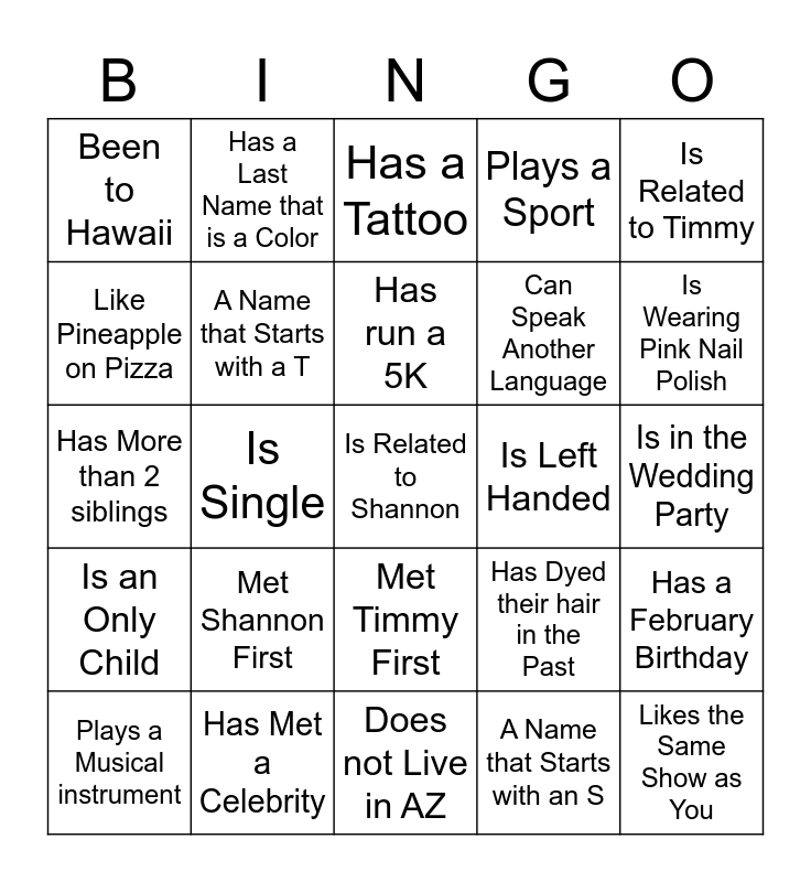 This bingo card has 25 words: Met Shannon First, Does not Live in AZ, Has run a 5K, Plays a Musical instrument, Is Related to Timmy, Been to Hawaii, Like Pineapple on Pizza, Has a Last Name that is a Color, Is Left Handed, Met Timmy First, Can Speak Another Language, Has More than 2 siblings, Has Dyed their hair in the Past, Has a February Birthday, A Name that Starts with a T, Likes the Same Show as You, Is in the Wedding Party, Has a Tattoo, Is Wearing Pink Nail Polish, Is Single, Is Related to Shannon, Has Met a Celebrity, Is an Only Child, Plays a Sport and A Name that Starts with an S.