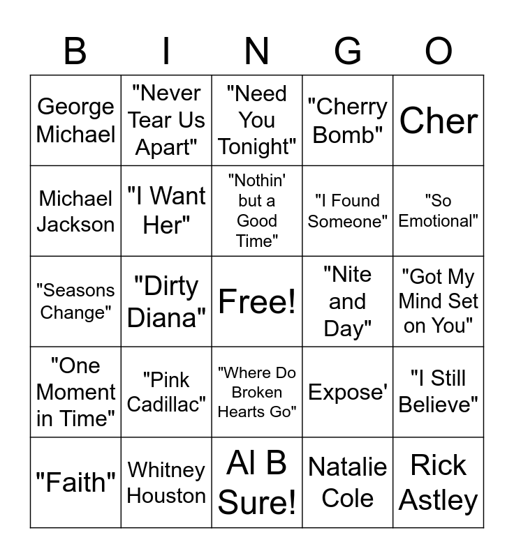 This bingo card has a free space and 29 words: "Faith", INXS, "Dirty Diana", Keith Sweat, George Michael, "Need You Tonight", "I Want Her", "Pink Cadillac", "Nite and Day", Whitney Houston, "Got My Mind Set on You", Rick Astley, Al B Sure!, Natalie Cole, "So Emotional", "Man in the Mirror", "Where Do Broken Hearts Go", "One Moment in Time", Cher, "Seasons Change", Expose', "The Way You Make Me Feel", "I Found Someone", Michael Jackson, "Cherry Bomb", "Never Tear Us Apart", "I Still Believe", "Nothin' but a Good Time" and "When It's Love".