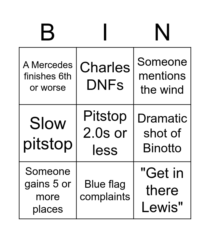 This bingo card has 59 words: "GAP TO HAM", Lap 1 incident, A team double-DNFs, Beeped-out swearing on team radio, Crash at turn 1, Seb gets points, Someone gains 5 or more places, A damaged car limps to the pits, "Get in there Lewis", "Plum last", Slow pitstop, Front wing replacement, Dramatic shot of Binotto, Kimi unhappy, Hamilton is #blessed, A Mercedes finishes 6th or worse, Rain is predicted, Pitstop 2.0s or less, "..two seconds Ted!", Blue flag complaints, Someone is interrupted by team radio, Someone mentions the wind, Perez finishes 5th or better, Ferrari on podium, Mazepin maze-bins it, Hamilton tyre update, Crash at the castle, Max argues with his engineer, David Coulthard appears, Karun Chandhok chips-in, CRINGE, A driver takes an escape road, Slow-mo shot of touching a barrier, A car just dies on it's own, Charles DNFs, BANTER, Williams get points, Dramatic shot of Toto Wolff, Ted Kravitz chips-in, Sky team are cheeky/sassy, Penalty given, Commentry mention slipstream/tow, Lewis doesn't win, Mick beats Maz, Red flag, Non-Merc/RB winner, McLaren on podium, "DRS wiiiide open", Full safety car, Solo crash, Gasly finishes 8th or better, Someone swears, sky apologizes, Team radio complaining, Two cars collide, Valtteri is cursed, Virtual safety car, 3 or more cars retire, Interview with a DNFd driver mid-race and Double-stack pitstop.