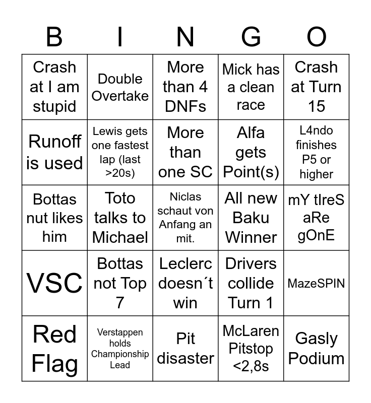This bingo card has a free space and 24 words: Bottas not Top 7, Verstappen holds Championship Lead, More than one SC, Red Flag, Crash at Turn 15, Crash at I am stupid, Runoff is used, Double Overtake, All new Baku Winner, Leclerc doesn´t win, Alfa gets Point(s), Bottas nut likes him, Drivers collide Turn 1, MazeSPIN, Lewis gets one fastest lap (last >20s), McLaren Pitstop <2,8s, mY tIreS aRe gOnE, More than 4 DNFs, L4ndo finishes P5 or higher, Toto talks to Michael, Gasly Podium, VSC, Mick has a clean race and Pit disaster.