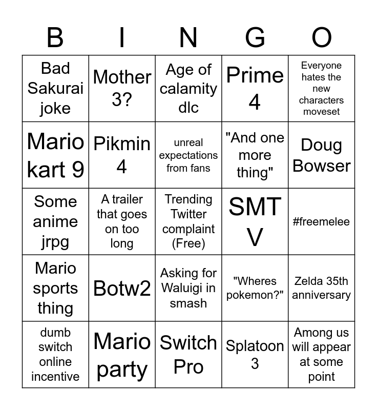 This bingo card has a free space and 24 words: Botw2, Mario party, unreal expectations from fans, dumb switch online incentive, Everyone hates the new characters moveset, Bad Sakurai joke, Mario kart 9, Mother 3?, SMT V, Asking for Waluigi in smash, "And one more thing", Some anime jrpg, "Wheres pokemon?", Zelda 35th anniversary, Pikmin 4, Splatoon 3, #freemelee, Age of calamity dlc, Doug Bowser, A trailer that goes on too long, Among us will appear at some point, Mario sports thing, Prime 4 and Switch Pro.