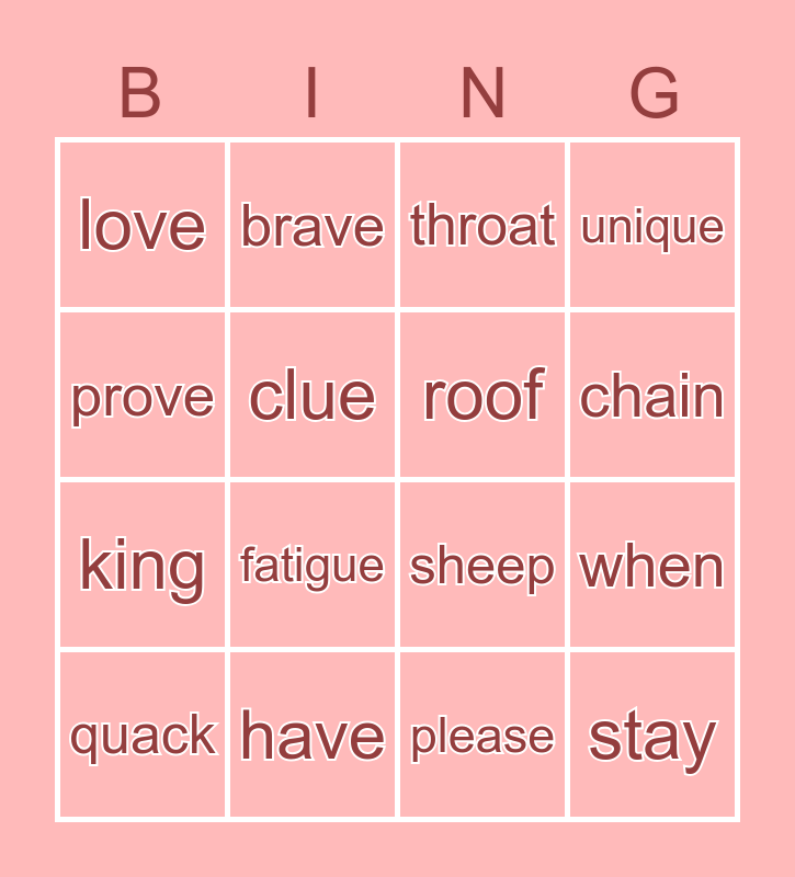This bingo card has 16 words: have, when, throat, love, king, brave, sheep, please, prove, clue, quack, unique, fatigue, chain, roof and stay.