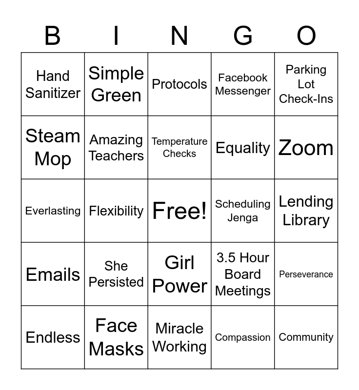 This bingo card has a free space and 24 words: She Persisted, Face Masks, Temperature Checks, Endless, Parking Lot Check-Ins, Hand Sanitizer, Steam Mop, Simple Green, Scheduling Jenga, Girl Power, Equality, Everlasting, 3.5 Hour Board Meetings, Perseverance, Amazing Teachers, Compassion, Lending Library, Protocols, Zoom, Flexibility, Community, Emails, Facebook Messenger and Miracle Working.