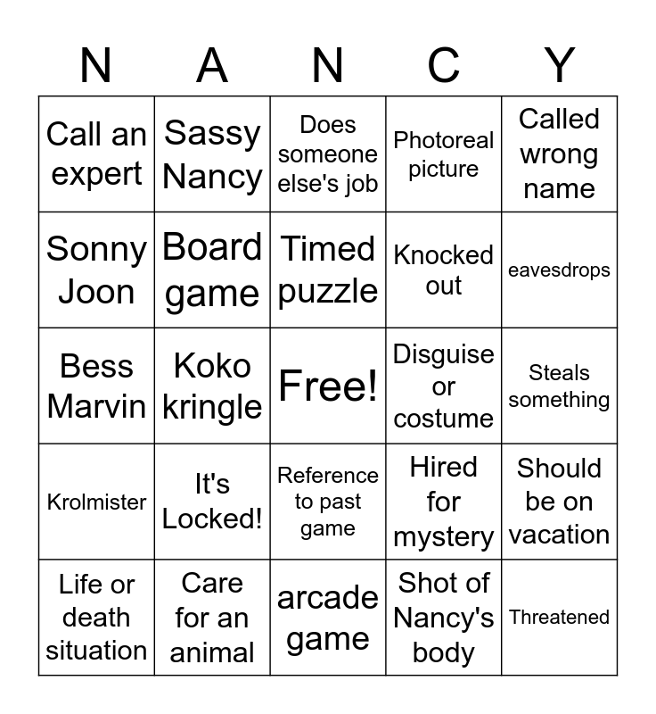 This bingo card has a free space and 24 words: It's Locked!, Care for an animal, Timed puzzle, Life or death situation, Called wrong name, Call an expert, Sonny Joon, Sassy Nancy, Disguise or costume, Reference to past game, Knocked out, Bess Marvin, Hired for mystery, Should be on vacation, Board game, Shot of Nancy's body, Steals something, Does someone else's job, eavesdrops, Koko kringle, Threatened, Krolmister, Photoreal picture and arcade game.