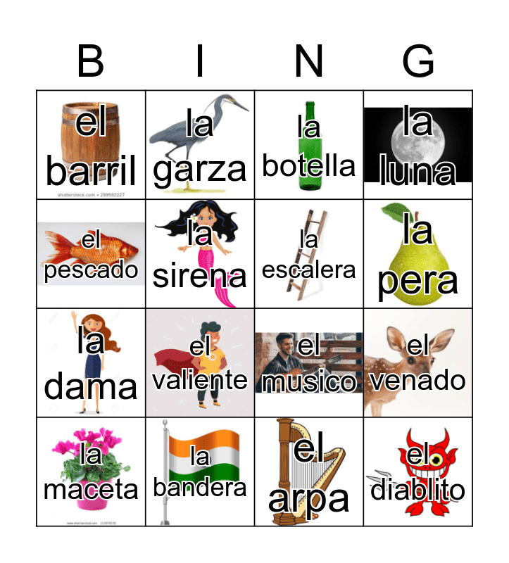 This bingo card has 30 images and 31 words: la campana, El cantarito, el venado, el cazo, el barril, la botella, la escalera, la mano, la bandera, la rana, el arpa, la maceta, el pajarito, la bota, el valiente, el nopal, el melon, la corona, el diablito, el tambor, el pescado, el gorrito, el corazon, la garza, la dama, la sirena, la luna, el musico, la palma, la pera and el pino.