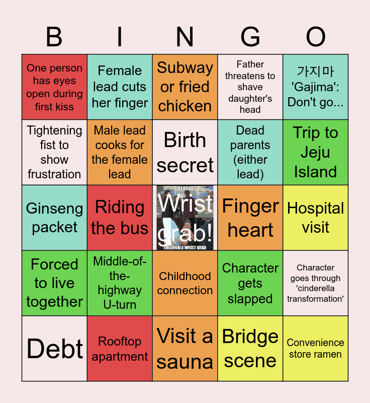 This bingo card has a free space and 30 words: Rooftop apartment, Back hug, Riding the bus, Amnesia, One person has eyes open during first kiss, Subway or fried chicken, Male lead cooks for the female lead, Childhood connection, Finger heart, Visit a sauna, Hospital visit, Convenience store ramen, Bridge scene, Heartbeat sound effect, Trip to Jeju Island, First snow, Character gets slapped, Forced to live together, Middle-of-the-highway U-turn, 가지마 'Gajima': Don't go..., Ginseng packet, Piggyback ride, Female lead cuts her finger, Dead parents (either lead), Tightening fist to show frustration, Father threatens to shave daughter's head, Character goes through 'cinderella transformation', Debt, Birth secret and Struggling family business.