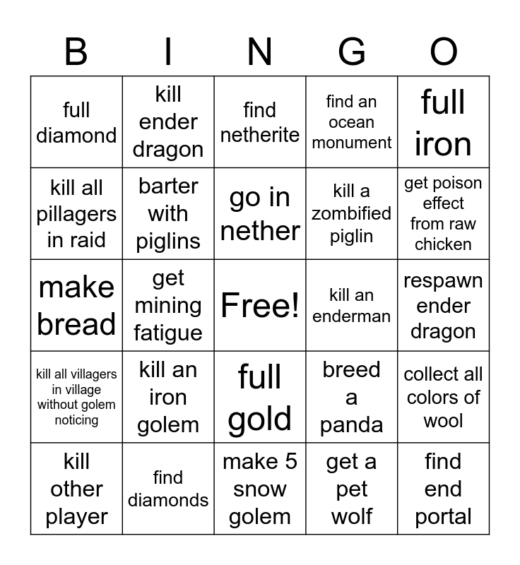 This bingo card has a free space and 24 words: kill an iron golem, find diamonds, go in nether, kill other player, full iron, full diamond, kill all pillagers in raid, kill ender dragon, kill an enderman, full gold, kill a zombified piglin, make bread, breed a panda, collect all colors of wool, barter with piglins, get a pet wolf, respawn ender dragon, find netherite, get poison effect from raw chicken, get mining fatigue, find end portal, kill all villagers in village without golem noticing, find an ocean monument and make 5 snow golem.