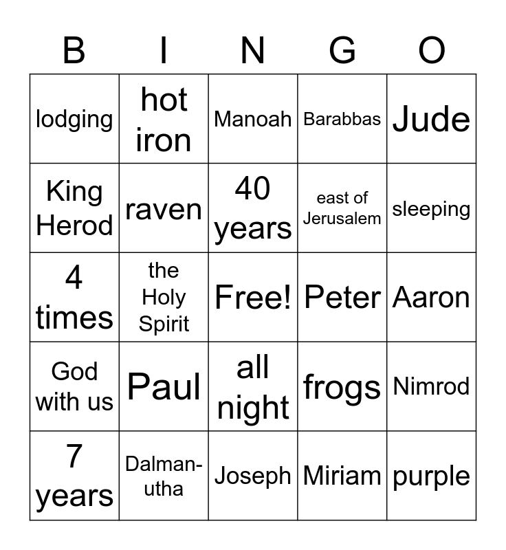 This bingo card has a free space and 24 words: Paul, Dalman-utha, 40 years, 7 years, Jude, lodging, King Herod, hot iron, Peter, all night, east of Jerusalem, 4 times, frogs, Nimrod, raven, Miriam, Aaron, Manoah, sleeping, the Holy Spirit, purple, God with us, Barabbas and Joseph.