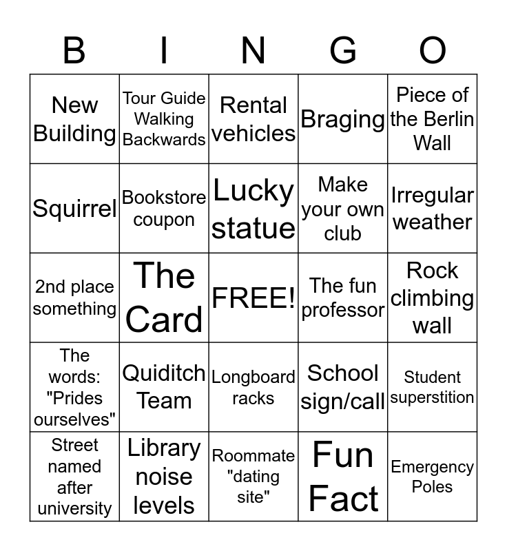 This bingo card has a free space and 24 words: Quiditch Team, Library noise levels, Lucky statue, Street named after university, Piece of the Berlin Wall, New Building, Squirrel, Tour Guide Walking Backwards, The fun professor, Longboard racks, Make your own club, 2nd place something, School sign/call, Student superstition, Bookstore coupon, Fun Fact, Rock climbing wall, Rental vehicles, Irregular weather, The Card, Emergency Poles, The words: "Prides ourselves", Braging and Roommate "dating site".
