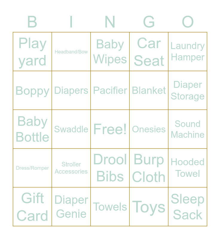 This bingo card has a free space and 24 words: Stroller Accessories, Diaper Genie, Pacifier, Gift Card, Laundry Hamper, Play yard, Boppy, Headband/Bow, Onesies, Drool Bibs, Blanket, Baby Bottle, Burp Cloth, Hooded Towel, Diapers, Toys, Sound Machine, Baby Wipes, Diaper Storage, Swaddle, Sleep Sack, Dress/Romper, Car Seat and Towels.