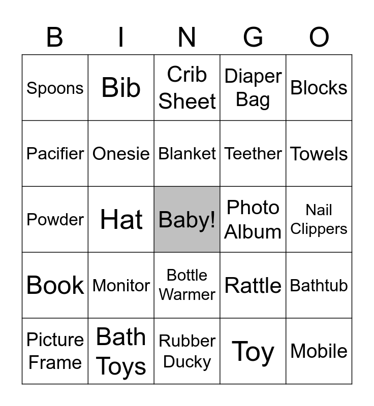This bingo card has a free space and 54 words: Wipes, Book, Socks, Dress, Bottle Warmer, Pack n Play, Diaper Bag, Money, Pacifier, Stuffed Animal, Spoons, Shoes, Bath Toys, Picture Frame, Play Mat, Rubber Ducky, Mobile, Teether, Washclothes, Nail Clippers, Rattle, Stroller, Photo Album, Blocks, Changing Pad, Bib, Bottle, Shampoo, Baby Food, Toy, Diapers, Medicine, Gift Card, Swing, Crib Sheet, Burp Clothes, Powder, Bathtub, Soap, Onesie, Jumperoo, Sippy Cup, Lotion, High Chair, Monitor, Thermometer, Music Box, Diaper Cream, Blanket, Hat, Towels, Bouncer, Diaper Pail and Car Seat.