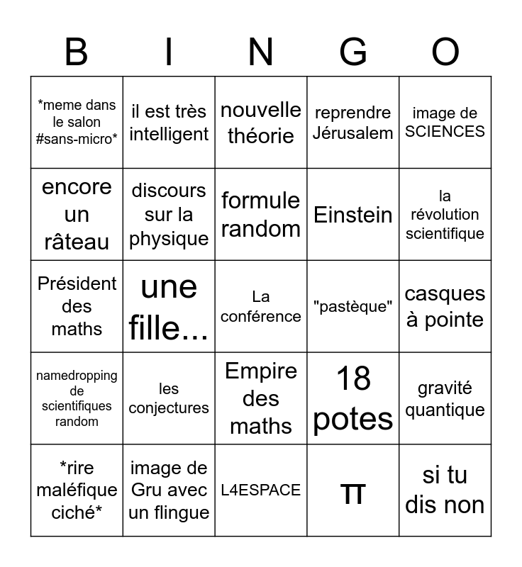 This bingo card has 25 words: les conjectures, L4ESPACE, formule random, *rire maléfique ciché*, image de SCIENCES, *meme dans le salon #sans-micro*, encore un râteau, il est très intelligent, "pastèque", Empire des maths, Einstein, Président des maths, 18 potes, gravité quantique, discours sur la physique, si tu dis non, casques à pointe, nouvelle théorie, la révolution scientifique, une fille..., La conférence, image de Gru avec un flingue, namedropping de scientifiques random, reprendre Jérusalem and π.