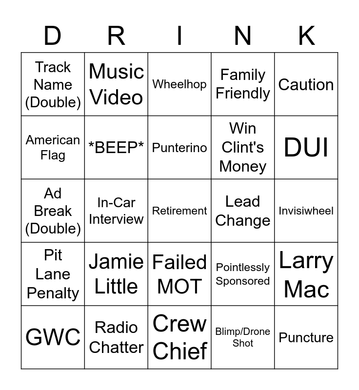 This bingo card has a free space and 24 words: Jamie Little, Radio Chatter, Punterino, GWC, Caution, Track Name (Double), American Flag, Music Video, Lead Change, Failed MOT, Win Clint's Money, Ad Break (Double), Pointlessly Sponsored, Larry Mac, *BEEP*, Blimp/Drone Shot, Invisiwheel, Wheelhop, DUI, In-Car Interview, Puncture, Pit Lane Penalty, Family Friendly and Crew Chief.