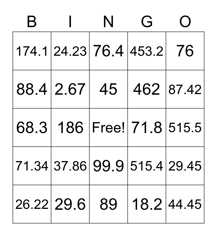 This bingo card has a free space and 24 words: 37.86, 29.6, 45, 26.22, 76, 174.1, 88.4, 24.23, 71.8, 99.9, 462, 68.3, 515.4, 29.45, 2.67, 18.2, 515.5, 76.4, 87.42, 186, 44.45, 71.34, 453.2 and 89.