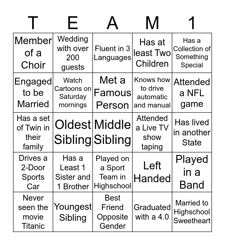 This bingo card has a free space and 24 words: Has a Least 1 Sister and 1 Brother, Youngest Sibling, Met a Famous Person, Never seen the movie Titanic, Has a Collection of Something Special, Member of a Choir, Engaged to be Married, Wedding with over 200 guests, Attended a Live TV show taping, Played on a Sport Team in Highschool, Knows how to drive automatic and manual, Has a set of Twin in their family, Left Handed, Played in a Band, Watch Cartoons on Saturday mornings, Graduated with a 4.0, Has lived in another State, Fluent in 3 Languages, Attended a NFL game, Oldest Sibling, Married to Highschool Sweetheart, Drives a 2-Door Sports Car, Has at least Two Children and Best Friend Opposite Gender.