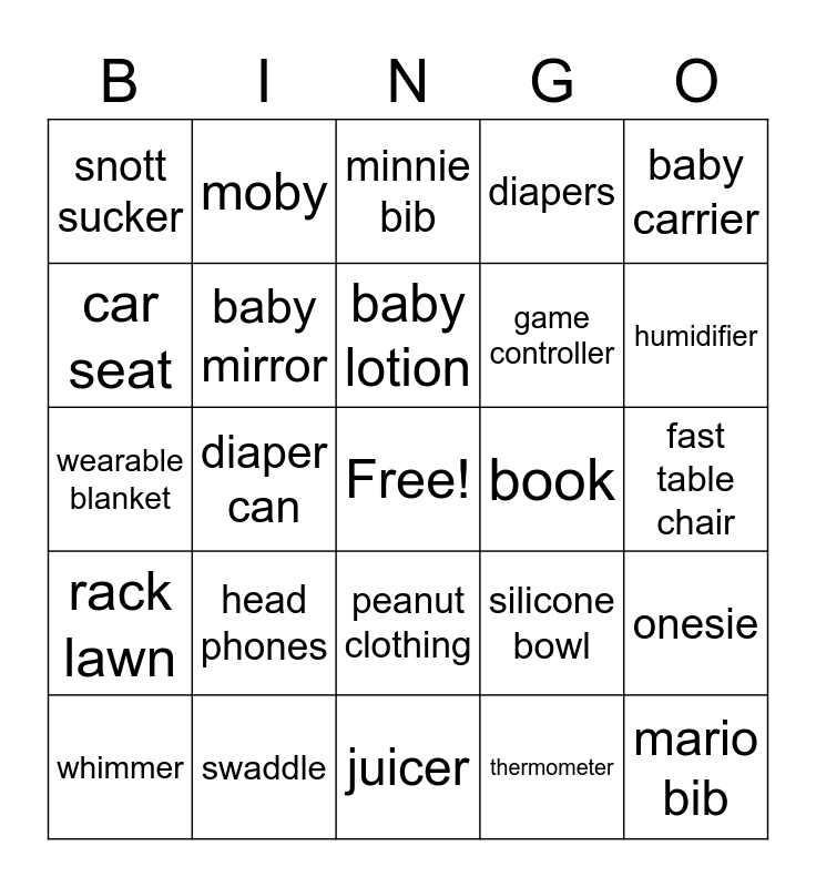 This bingo card has a free space and 24 words: head phones, swaddle, baby lotion, whimmer, baby carrier, snott sucker, car seat, moby, book, peanut clothing, game controller, wearable blanket, silicone bowl, onesie, baby mirror, thermometer, fast table chair, minnie bib, humidifier, diaper can, mario bib, rack lawn, diapers and juicer.