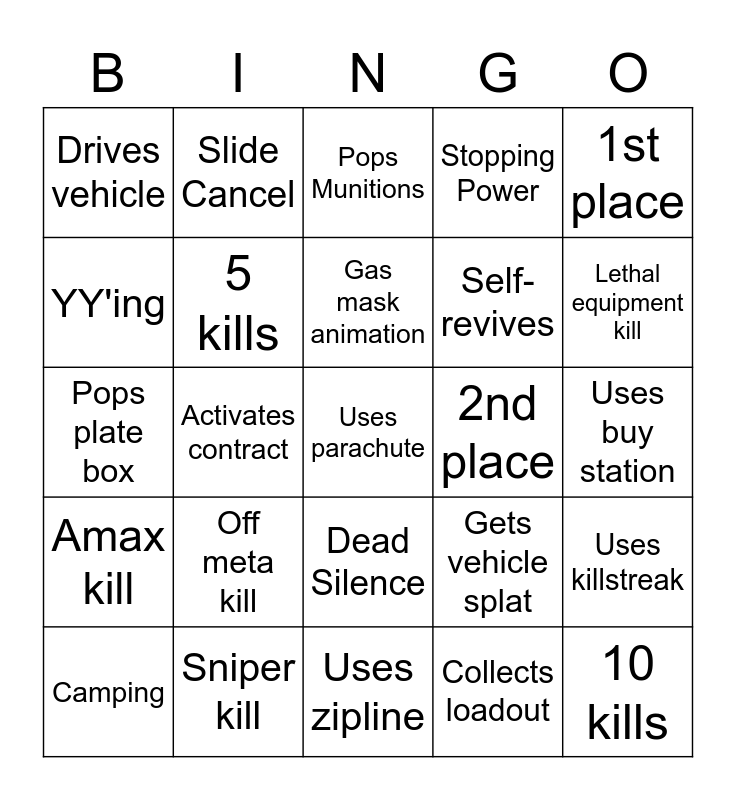 This bingo card has 25 words: Amax kill, Sniper kill, Uses parachute, Collects loadout, 1st place, Drives vehicle, Slide Cancel, Pops Munitions, 2nd place, Uses killstreak, YY'ing, 5 kills, Uses zipline, Gets vehicle splat, Lethal equipment kill, Camping, Activates contract, Gas mask animation, Self-revives, Uses buy station, Pops plate box, Off meta kill, Dead Silence, Stopping Power and 10 kills.