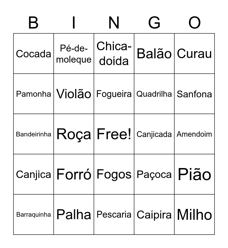 This bingo card has a free space and 27 words: Paçoca, Pipoca, Quadrilha, Pescaria, Pamonha, Chica-doida, Pé-de-moleque, Canjica, Canjicada, Pião, Bandeirinha, Balão, Barraquinha, Palha, Sanfona, Viola, Violão, Fogueira, Forró, Cocada, Amendoim, Caipira, Roça, Milho, Fogos, Curau and Bolo de fubá.