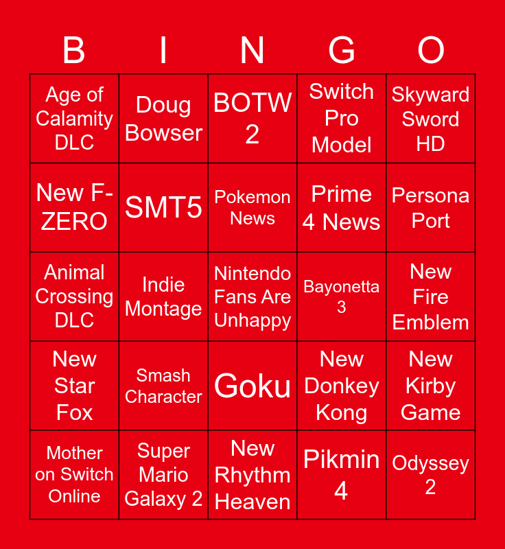 This bingo card has a free space and 24 words: Smash Character, Super Mario Galaxy 2, Pokemon News, Mother on Switch Online, Skyward Sword HD, Age of Calamity DLC, New F-ZERO, Doug Bowser, Bayonetta 3, Goku, Prime 4 News, Animal Crossing DLC, New Donkey Kong, New Kirby Game, SMT5, Pikmin 4, New Fire Emblem, BOTW 2, Persona Port, Indie Montage, Odyssey 2, New Star Fox, Switch Pro Model and New Rhythm Heaven.