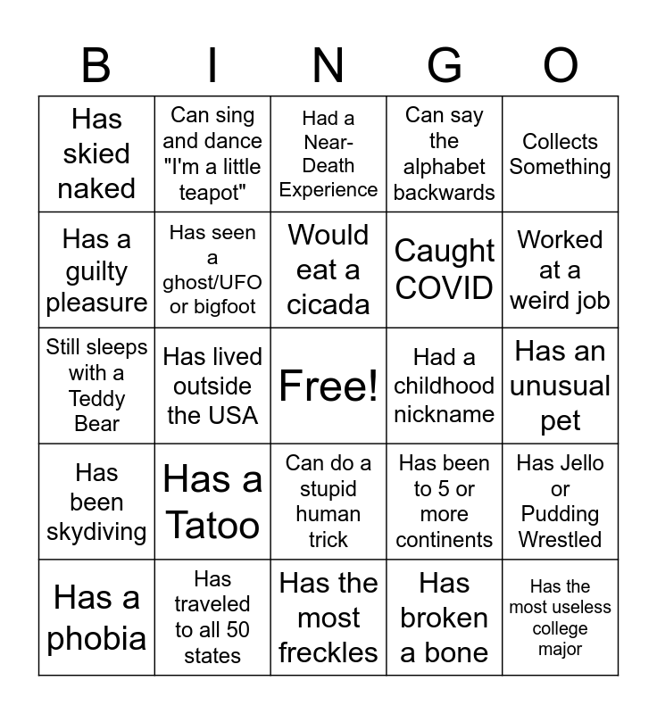 This bingo card has a free space and 24 words: Has a Tatoo, Has traveled to all 50 states, Would eat a cicada, Has a phobia, Collects Something, Has skied naked, Has a guilty pleasure, Can sing and dance "I'm a little teapot", Had a childhood nickname, Can do a stupid human trick, Caught COVID, Still sleeps with a Teddy Bear, Has been to 5 or more continents, Has Jello or Pudding Wrestled, Has seen a ghost/UFO or bigfoot, Has broken a bone, Has an unusual pet, Had a Near-Death Experience, Worked at a weird job, Has lived outside the USA, Has the most useless college major, Has been skydiving, Can say the alphabet backwards and Has the most freckles.
