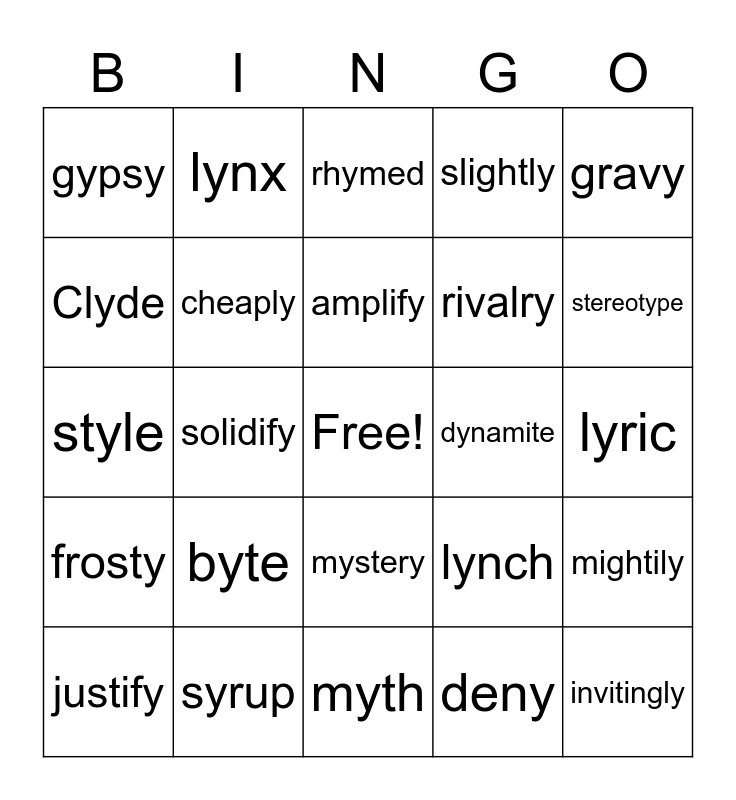This bingo card has a free space and 62 words: sandy, syrup, gym, frosty, python, hybrid, cheaply, ruby, rivalry, objectify, slightly, baby, Clyde, dirty, horrify, gypsy, invitingly, gravy, imply, amplify, dynamite, rhymed, justify, deny, physics, hydrant, mortify, gypsum, mightily, cymbal, enzyme, crypt, stylish, mystify, lyric, lynx, lullaby, petrify, solidify, resupply, style, identify, byte, pyre, stereotype, lynch, ditzy, symptom, nylon, humidify, mystery, myth, hype, symbol, lyre, occupy, oxygen, hyphen, typical, calypso, crucify and stupefy.