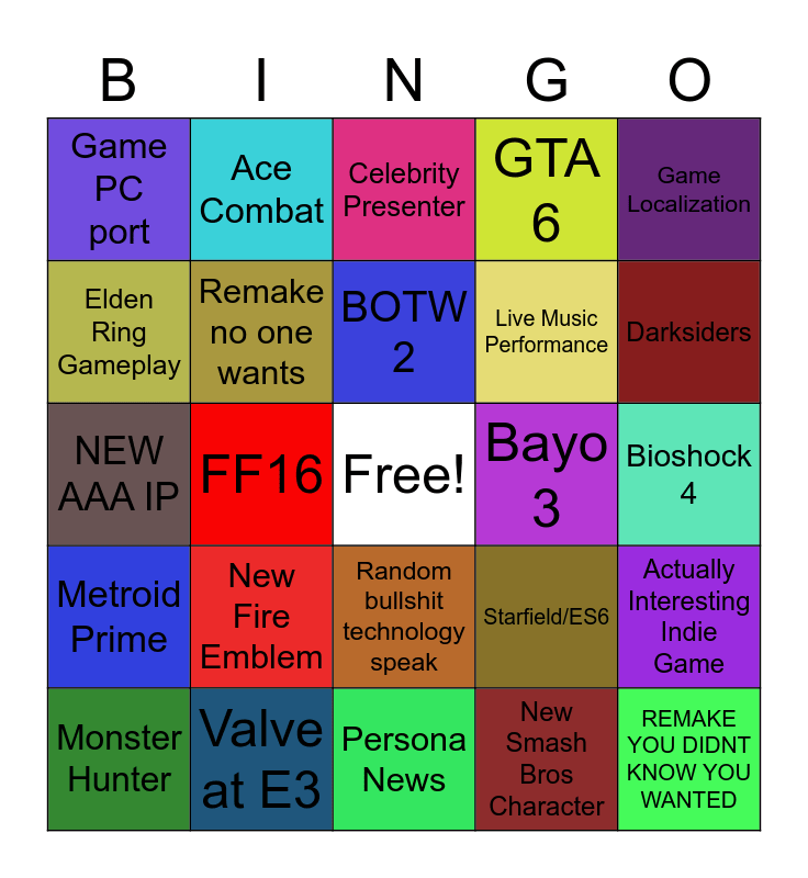 This bingo card has a free space and 24 words: New Fire Emblem, Valve at E3, BOTW 2, Monster Hunter, Game Localization, Game PC port, Elden Ring Gameplay, Ace Combat, Bayo 3, Random bullshit technology speak, Live Music Performance, NEW AAA IP, Starfield/ES6, Actually Interesting Indie Game, Remake no one wants, New Smash Bros Character, Bioshock 4, Celebrity Presenter, Darksiders, FF16, REMAKE YOU DIDNT KNOW YOU WANTED, Metroid Prime, GTA 6 and Persona News.