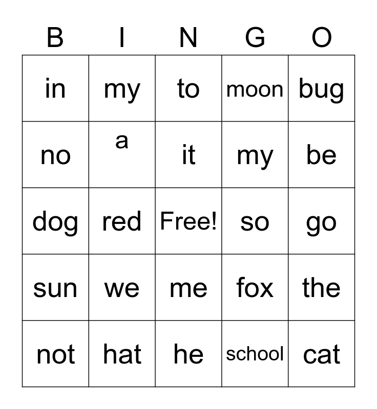 This bingo card has a free space and 25 words: we, he, it, not, bug, in, no, my, so, me, my, dog, fox, the, a, I, go, to, be, red, cat, hat, sun, moon and school.