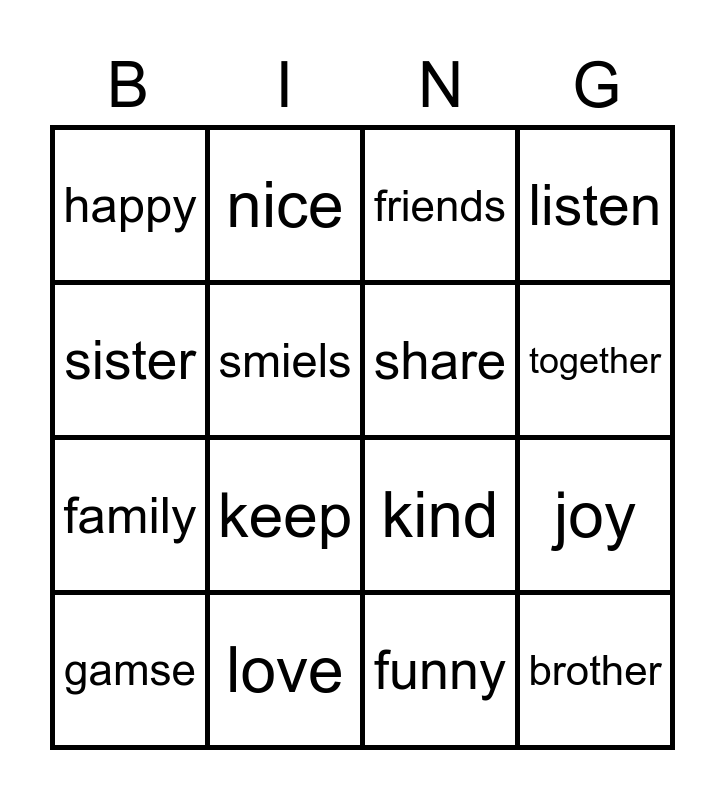 This bingo card has 16 words: love, joy, friends, happy, family, nice, kind, funny, sister, smiels, gamse, listen, keep, together, share and brother.