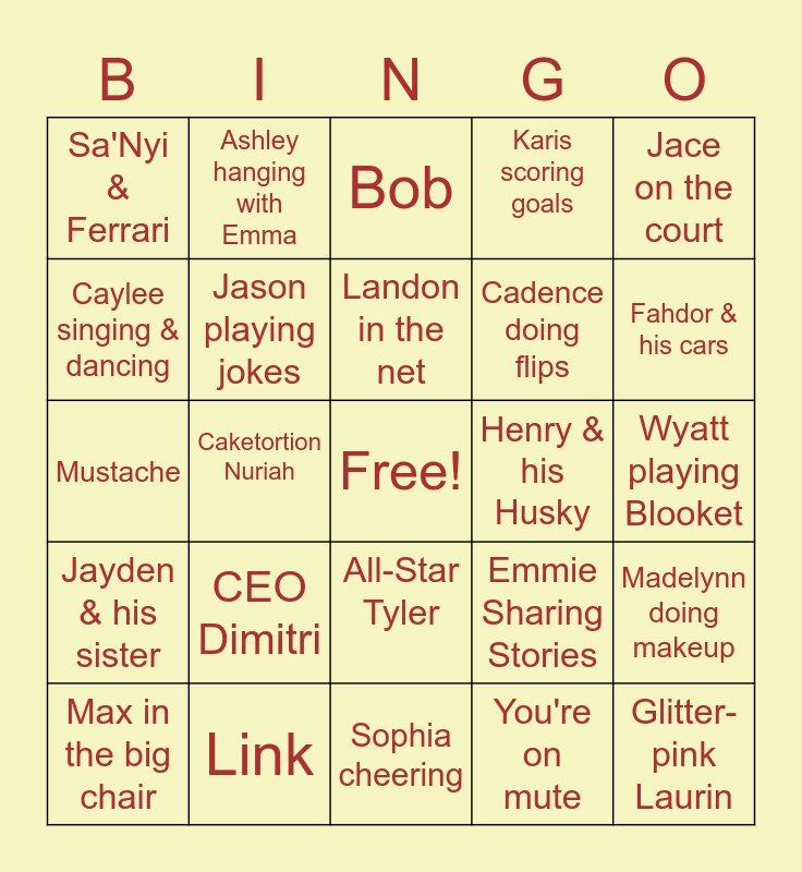 This bingo card has a free space and 39 words: Caleb 100%, Emma & horses, John on his tractor, Jason playing jokes, Max in the big chair, All-Star Tyler, Landon in the net, Davis always ready, Jace on the court, Jayden & his sister, Caketortion Nuriah, Karis scoring goals, Glitter-pink Laurin, Wyatt playing Blooket, Henry & his Husky, CEO Dimitri, Shane at the plate, Sa'Nyi & Ferrari, Metal Sonic Ian, Emmie Sharing Stories, Caylee singing & dancing, Sophia cheering, Cadence doing flips, Fahdor & his cars, Eli Gamer, Sari & her bunnies, Abby wants a corgi, Maria & her lizard, Joseph man of mystery, Ashley hanging with Emma, Miranda going shopping, Dino Nuggies, Bob, Link, You're on mute, Spam the Chat, Madelynn doing makeup, Mustache and Kicked out of Zoom.