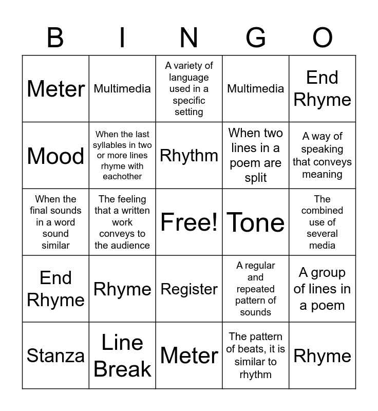 This bingo card has a free space and 24 words: Rhyme, Line Break, Rhythm, Stanza, End Rhyme, Meter, Mood, Multimedia, Tone, Register, When two lines in a poem are split, When the final sounds in a word sound similar, A regular and repeated pattern of sounds, A group of lines in a poem, When the last syllables in two or more lines rhyme with eachother, The pattern of beats, it is similar to rhythm, The combined use of several media, A variety of language used in a specific setting, A way of speaking that conveys meaning, The feeling that a written work conveys to the audience, Rhyme, End Rhyme, Multimedia and Meter.