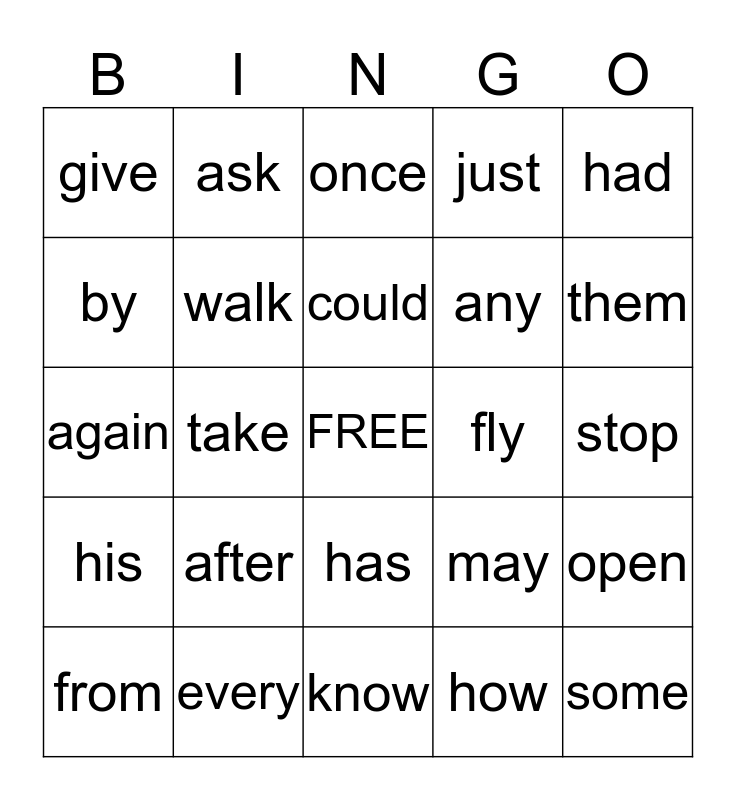This bingo card has a free space and 24 words: after, every, could, from, had, give, by, ask, fly, has, any, again, may, open, walk, how, stop, once, them, take, some, his, just and know.