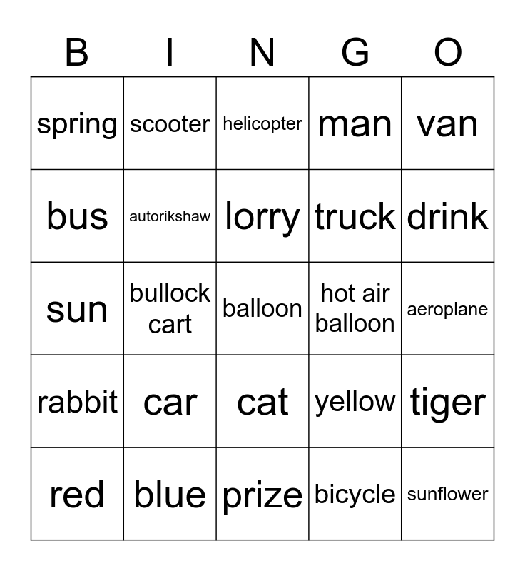 This bingo card has a free space and 24 words: car, blue, lorry, red, van, spring, bus, scooter, hot air balloon, cat, truck, sun, yellow, tiger, autorikshaw, bicycle, aeroplane, helicopter, drink, bullock cart, sunflower, rabbit, man and prize.