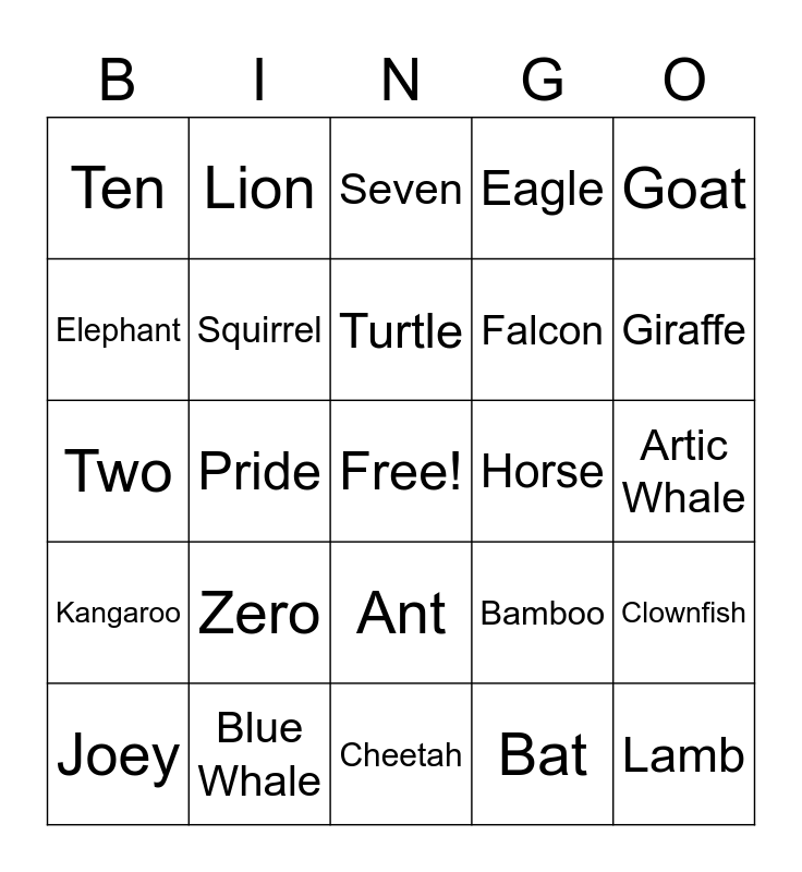 This bingo card has a free space and 29 words: Joey, Chicken, Pride, Black, Ten, Seven, Squirrel, Zero, Horse, Blue Whale, Artic Whale, Lamb, Cheetah, Bat, Giraffe, Ostrich, Ant, Kangaroo, Goat, Two, Bamboo, Hummingbird, Falcon, Elephant, Eagle, Lion, Clownfish, Turtle and Stingray.