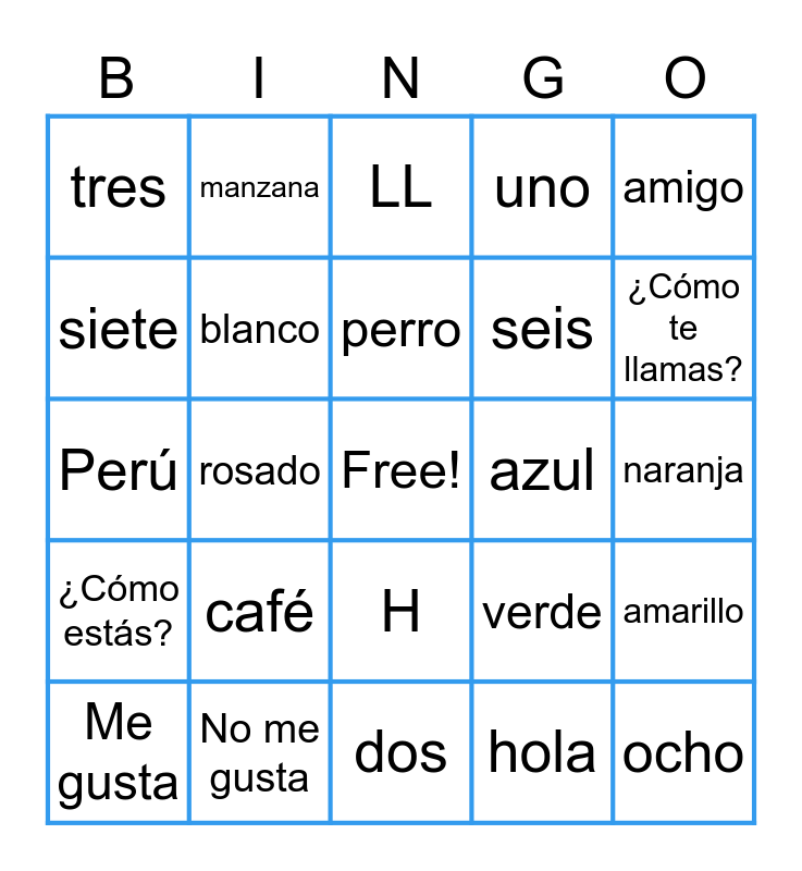 This bingo card has a free space and 34 words: Me llamo, hola, cinco, rojo, ¿Cómo estás?, blanco, amigo, Me gusta, manzana, J, perro, LL, llama, diez, azul, ¿Cómo te llamas?, No me gusta, Perú, café, verde, H, adiós, tres, naranja, dos, ocho, uno, cuatro, seis, siete, nueve, rosado, amarillo and morado.