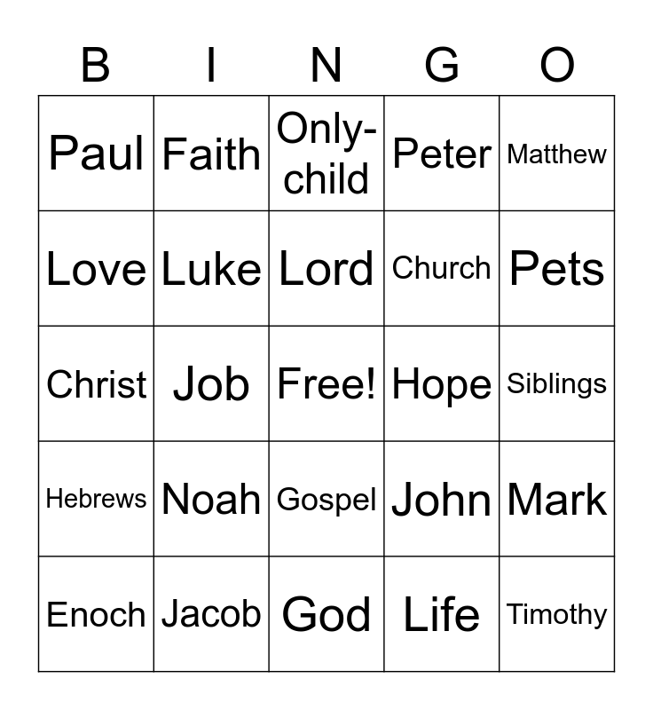 This bingo card has a free space and 24 words: Noah, Jacob, Lord, Enoch, Matthew, Paul, Love, Faith, Hope, Gospel, Church, Christ, John, Mark, Luke, Life, Siblings, Only-child, Pets, Job, Timothy, Hebrews, Peter and God.