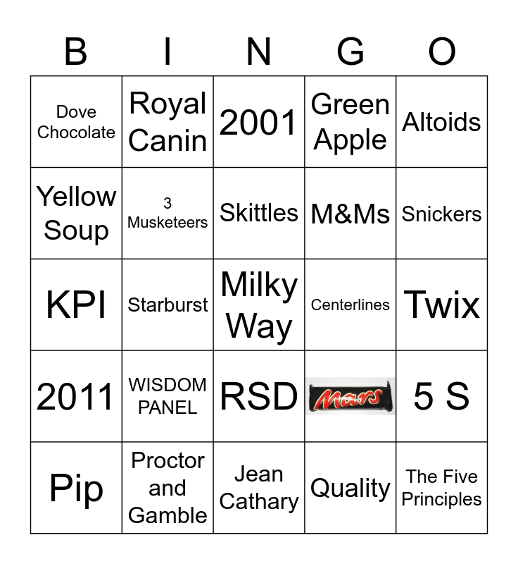 This bingo card has 1 images and 26 words: The Five Principles, M&Ms, Jean Cathary, Yellow Soup, 2001, Royal Canin, 2011, Centerlines, 5 S, KPI, Green Apple, Pip, Proctor and Gamble, Snickers, Eukanuba, 3 Musketeers, Skittles, WISDOM PANEL, Dove Chocolate, Twix, Quality, Starburst, Milky Way, RSD, Altoids and Nutrition Academy.