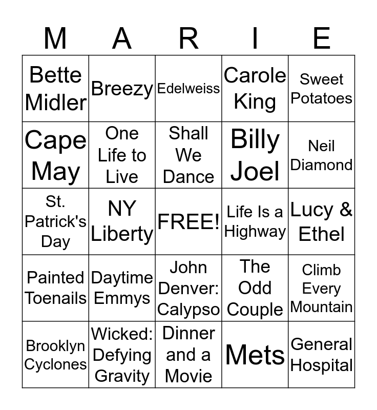 This bingo card has a free space and 24 words: Daytime Emmys, Wicked: Defying Gravity, Shall We Dance, Brooklyn Cyclones, Sweet Potatoes, Bette Midler, Cape May, Breezy, Life Is a Highway, John Denver: Calypso, Billy Joel, St. Patrick's Day, The Odd Couple, Climb Every Mountain, One Life to Live, Mets, Lucy & Ethel, Edelweiss, Neil Diamond, NY Liberty, General Hospital, Painted Toenails, Carole King and Dinner and a Movie.